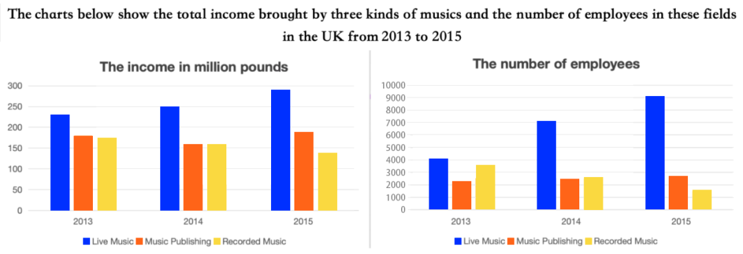 本次考试有同学反馈听力难度还可以,但阅读部分不简单,前半场信心满满,后半场考的心都颤了。小西根据网上考生的回忆,整理了本次考试的答案,以供大家参考。History of natural purple dyes until 19th century·Prehistoric cave paintings used purple made from iron oxide.· This was mixed with 31fat to produce a stick for colouring.· Tyrian Purple dye was made from a small 32 snail· it worked on many kinds of material, but particularly well on 33 wool.· The Romans used manganese to make coloured glass.· Purple has long been a new study symbol of 34 royalty in many cultares· Poor people used 35 blackberries to dye cloth, but the colourfaded easily.William Perkin and development of artificial dyes.·In 1856, Perkin was oking for ways to produce a daug to treat 36 malaria.· He accidentally combined chemicals which farned purple.· He called the dye 'mauveine, after a flower of the same colour.· He made the colour stable so 37 sunlight would not affect it.· Queen Victoria wore a dress made of 38 silk dyed with mauveine, whichpromoted the colour.· After the dye was produced in a 39 factory it became extremely common.· Perkin's work had a huge impact on medicine and 40 fashion.1. E19 was the first place to grow date palms. FALSE2. Bhed elche produced greater number than other varieties. NOT GIVEN4. Tools used in Elche were similar to those elsewhere. FALSE5. lt is hard to tell the difference between climbing ropes and ordinary cord.TRUE6. lt was rewarded World Heritage because of beauty of its surrounding regions. FALSE7. Tourists surprised due to the huge number of date palms. TRUE8. Th&, date palm trees were introduced to Peru, where they had neverbefore.(原文第2段)9. Date palm trees would be brought to lran and Egypt for its problems of diseases.10. Date Palm trees in Elche is regarded asa museum.(第7 段同义替换)11. There areabout 200,000 in the Elche center.(第7段)12. Gates control the flow of the river (第8 段)2013年-2015年三年中,UK三种不同的音乐总收入和雇员的数量。