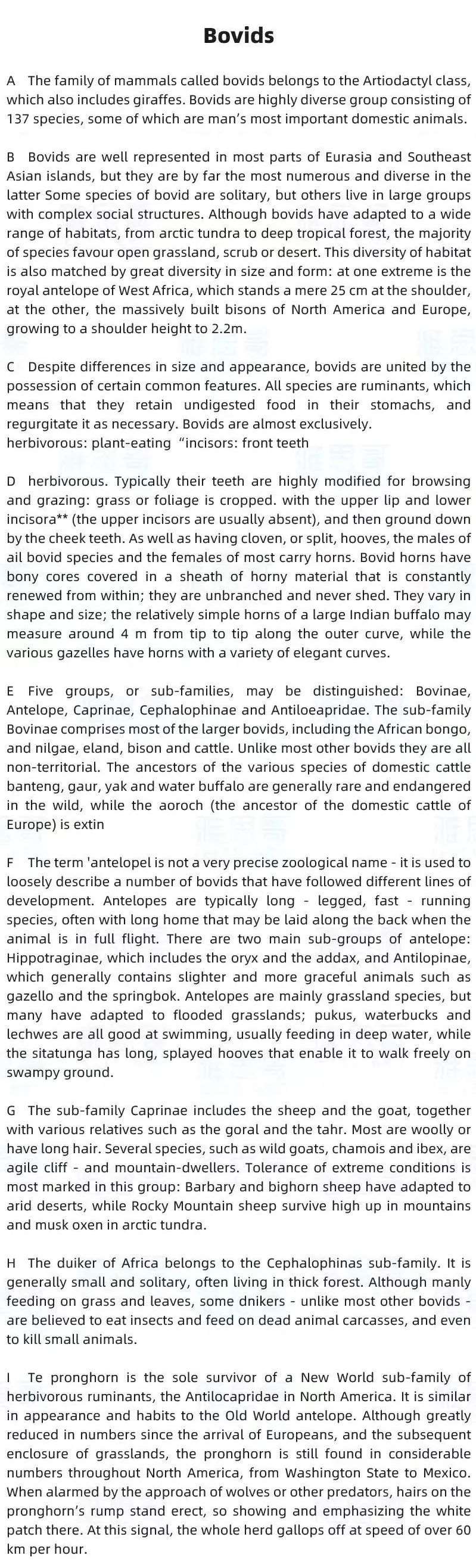 小西根据网上考生的回忆,整理了本次考试的答案,以供大家参考。In which region is the biggest range of bovids to be found?Most bovids have a preference for living inWhich of the following features do all bovids have in common?B. They have upper incisorsC. They store food in the bodyD. Their hooves are undivided4. C:can endure very harsh environments5. B:includes the ox and the cow6. D:may supplement its diet with meat7. A:can usually move a speed8. B:does not defend a particular area of land以下为List of sub-families选项题目:What is the smallest species of Bovid called题目:Which species of Bovinae hos now died out?题目:What facilitates the movement of the sitatunga over wetland?题目:What sort of terrain do barbary sheep live in?题目:What is the only living member of the Antilocapridae sub-family?主题:Mark Strizic 一个澳洲摄影师的职业发展Nowadays more and more people want to get things done instantly. Why is it? Do you think it is a positive or negative development?如果你: