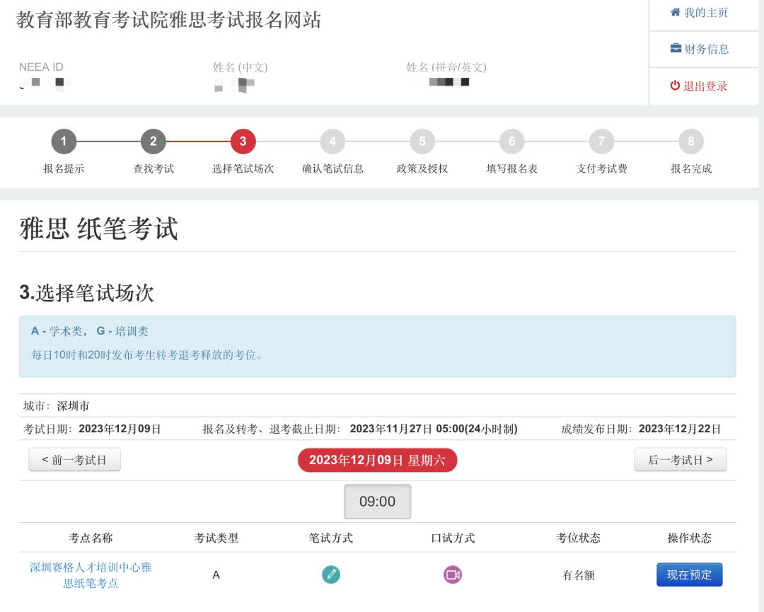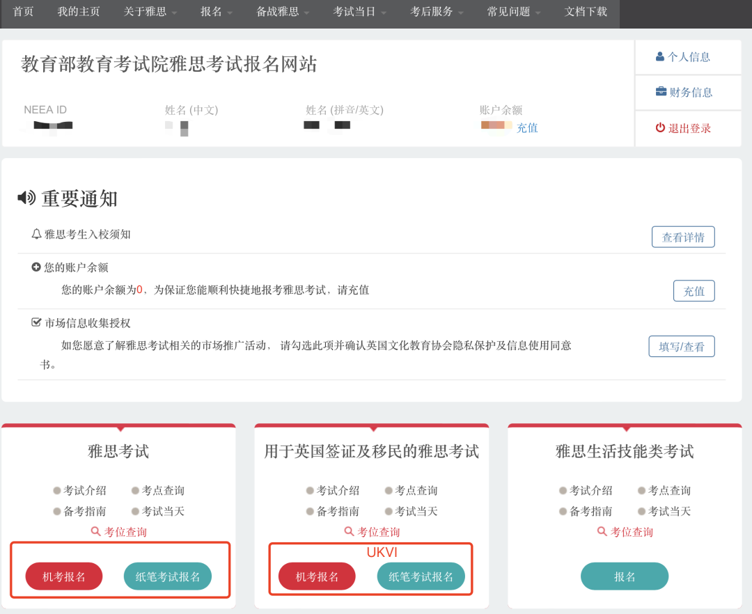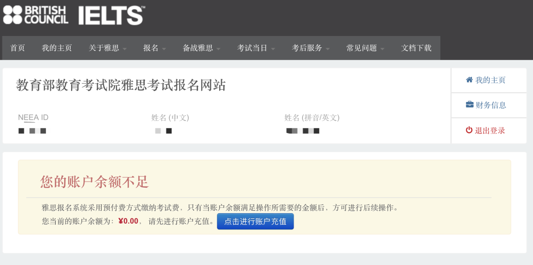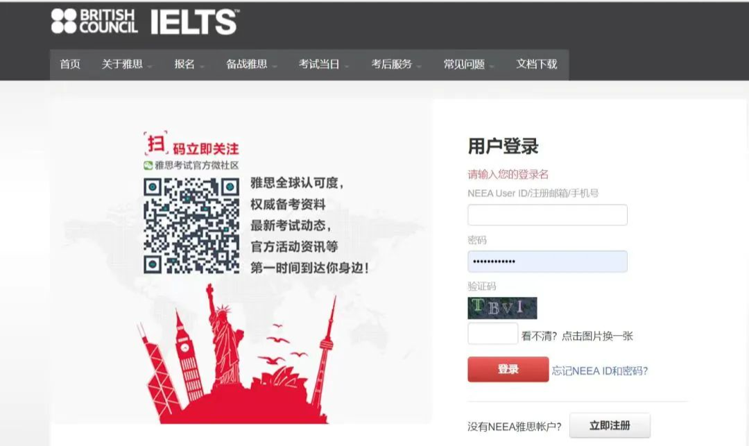 注意:上面确认提交之后,就注册成功了。系统会自动给你生成一个你的NEEA ID,可以把这个账号ID记录一下,同时邮箱也会收到注册成功的邮件。1. 登录账户(注册成功后,考生激活你的雅思账户,通过手机短信验证码激活账户。):2.考试费充值:点击报名或充值后,自动跳转⾄账户充值界⾯,选择【充值】注意:雅思考试采⽤预付费⽅式报考,考⽣需要先选择相应考试类型并预付费⽤。2026年一月起普通雅思考试和UKVI雅思费用均下调到1990元,选择相应的考试进行充值付费。点击⽀付后,⾃动跳转⾄⽀付界⾯。3.考位查询,付款之后,就可以开始选择考位、考试时间,报名考试。根据自己需要选择的考试情况点击对应的考试。费⽤充值成功后,下面进行查找考试-选择考场和时间流程。1.【雅思报名提示】:考生在观看后需勾选:☑我已知晓并同意以上安排,确认继续报名。2.【查找考试】:选择“纸笔/机考”、“考试城市”、“考试⽇期”,点击考位查询。3.【选择笔试场次】:如果选择的考场考位还有席位,可点击“现在预定”。* 如果对应考场没有考位,则会显示【名额暂满】,已经不能报考的考场为【已截⽌】。注意:已满18岁的考生直接填写报名表,未成年⼈需要填写家⻓信息,下载《未成年考⽣监护⼈确认书》,并上传扫描件。注意:需要在预定考位后的30分钟内,完成填写,否则⽆法锁定考位。