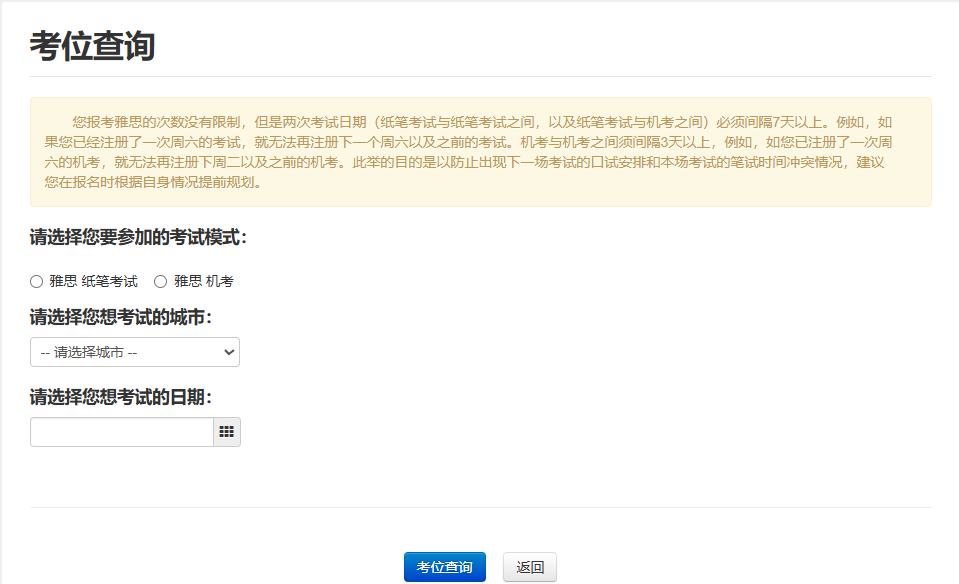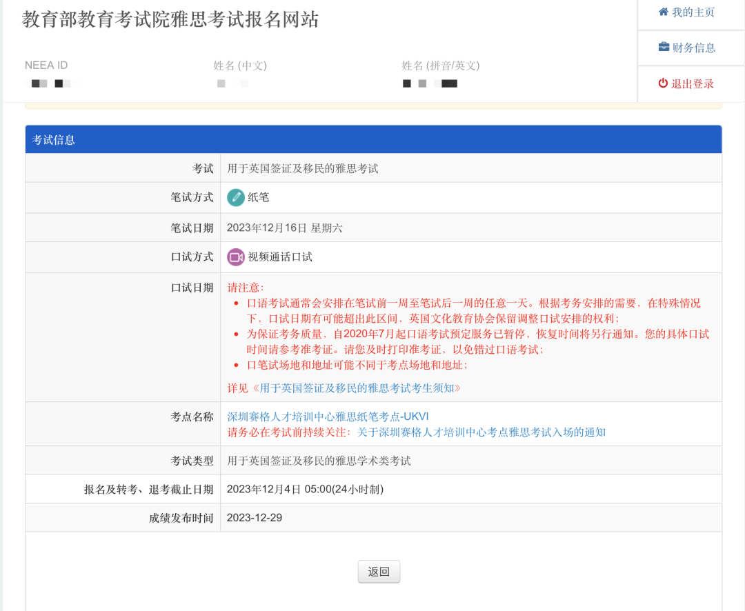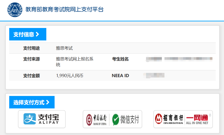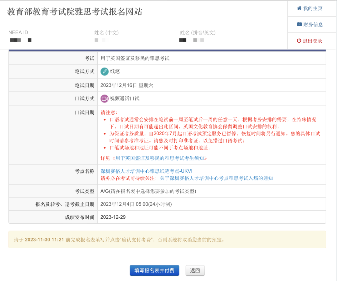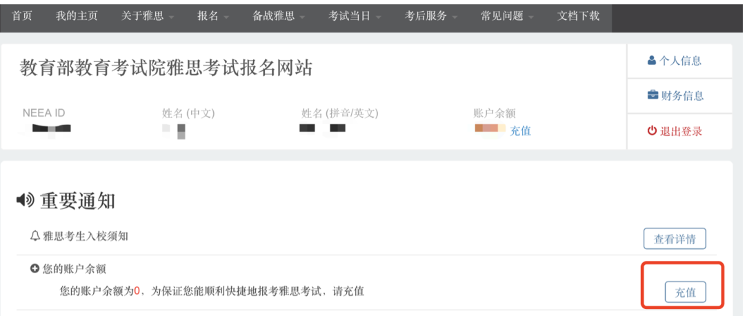 注意:上面确认提交之后,就注册成功了。系统会自动给你生成一个你的NEEA ID,可以把这个账号ID记录一下,同时邮箱也会收到注册成功的邮件。1. 登录账户(注册成功后,考生激活你的雅思账户,通过手机短信验证码激活账户。):2.考试费充值:点击报名或充值后,自动跳转⾄账户充值界⾯,选择【充值】注意:雅思考试采⽤预付费⽅式报考,考⽣需要先选择相应考试类型并预付费⽤。2026年一月起普通雅思考试和UKVI雅思费用均下调到1990元,选择相应的考试进行充值付费。点击⽀付后,⾃动跳转⾄⽀付界⾯。3.考位查询,付款之后,就可以开始选择考位、考试时间,报名考试。根据自己需要选择的考试情况点击对应的考试。费⽤充值成功后,下面进行查找考试-选择考场和时间流程。1.【雅思报名提示】:考生在观看后需勾选:☑我已知晓并同意以上安排,确认继续报名。2.【查找考试】:选择“纸笔/机考”、“考试城市”、“考试⽇期”,点击考位查询。3.【选择笔试场次】:如果选择的考场考位还有席位,可点击“现在预定”。* 如果对应考场没有考位,则会显示【名额暂满】,已经不能报考的考场为【已截⽌】。注意:已满18岁的考生直接填写报名表,未成年⼈需要填写家⻓信息,下载《未成年考⽣监护⼈确认书》,并上传扫描件。注意:需要在预定考位后的30分钟内,完成填写,否则⽆法锁定考位。