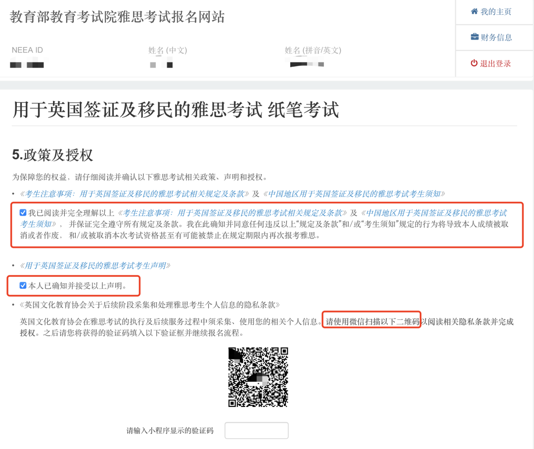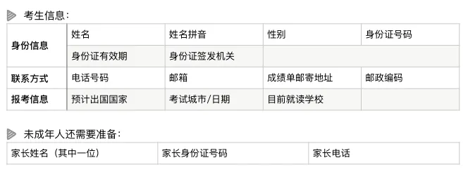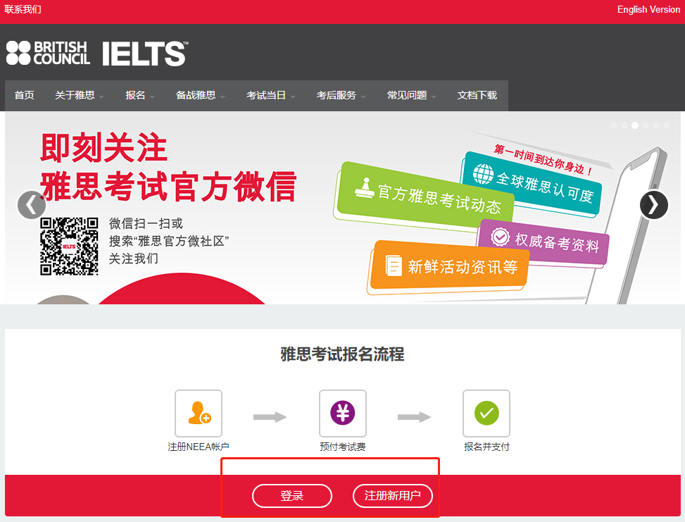 普通雅思考试分为学术类(A类,Academic)和培训类(G类,General Training)。这两种类型的考试均由听力、阅读、写作和口语四部分组成。其中,A类和G类的听力和口语使用相同的试题,阅读和写作使用不同试题。A类雅思考试对考生的英语水平进行测试,评估考生的英语水平是否满足申请本科及研究生及以上学位的要求,适合准备出国留学的同学。G类雅思考试着重考核基本语言技能,适用于计划在英语国家参加工作或移民,或申请培训及非文凭类课程的人士。用于英国签证及移民的雅思考试是为满足英国签证与移民局(UKVI)所规定的特殊考务要求而开设的考试。该考试的考试内容, 形式, 难度等级, 考官及评分标准等均与现有雅思考试相同。仅考试*单会有些许不同,其上会注明考生参加的是用于英国签证及移民的雅思考试。测试考生的为CEFR(欧洲语言共同参考框架)A1及B1级别两类。该考试旨在满足英国签证与移民局(UKVI)对英国特定签证申请的要求。CEFR标准国际通用,主要用于衡量语言学习者使用某种语言的熟练程度。A1级别,适用于:配偶,探亲类英国签证申请,难度等同于英国国家资格框架(NQF)中定义的英语入门1级水平。B1级别,适用于:入籍,永居类英国签证申请,难度等同于英国国家资格框架(NQF)中定义的英语入门3级水平。登录雅思官方报名网址:https://ielts.neea.cn/ ,报考⼈需要提前准备好以下资料:登录雅思官方报名网址,新用户进入页面后,先点击右下方“注册新用户”; 之前注册过账号的考生可直接“登录”。1. 点击进入界面后,仔细阅读雅思报名网站用户协议,先打勾☑“本人已阅读、接受并同意本网站报名协议”,再点击“同意”方可继续。2.按照页面填写自己的个人信息,注意这里的信息要仔细填写,不能填错。3.后面还有一个“确认信息”的步骤,这里再检查一遍,没有问题再点击“确认提交”;有问题的话就点击“修改信息”。