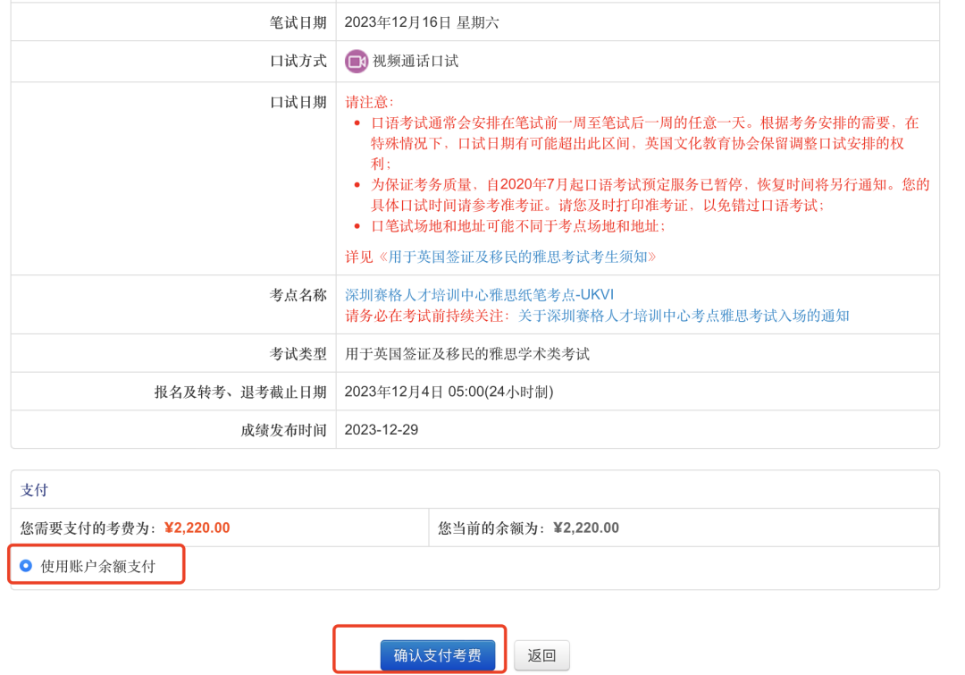 考试费⽤将从预存账户中扣除。报名成功后,考试中⼼会给考⽣发送电⼦邮件确认报名成功。8.【报名完成】当下面这个页面的时候就表示考试注册成功了。最后记得按时登录账号,查看口语考试时间和打印准考证。笔试日期前10天可以登录网站打印准考证,而报考机考的考生是在笔试日期前3天打印准考证,在“我的状态”页面查看自己的考号、口试时间、口笔试地址。